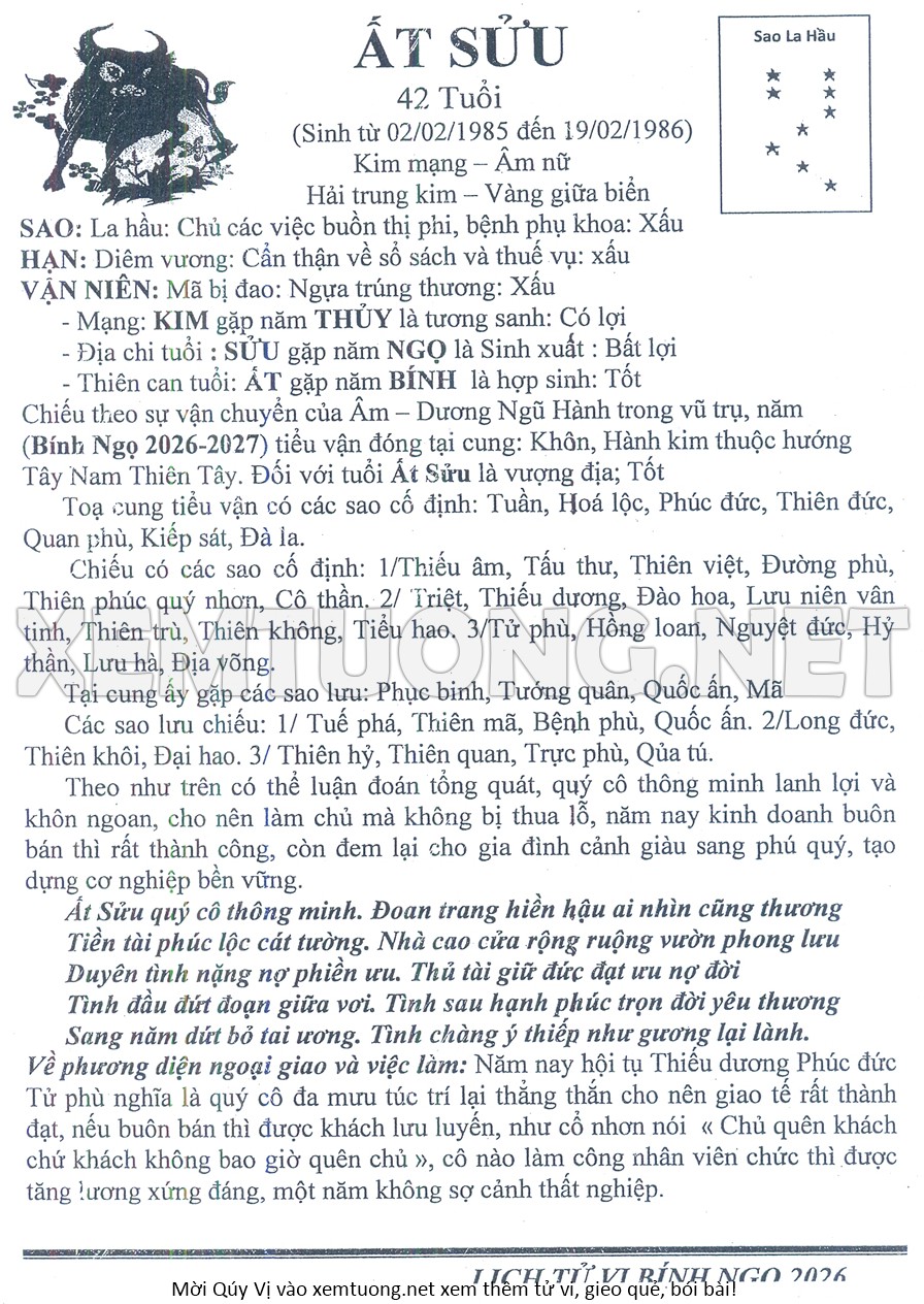 Tử Vi Năm Bính Ngọ 2026 mạng nữ ẤT SỬU