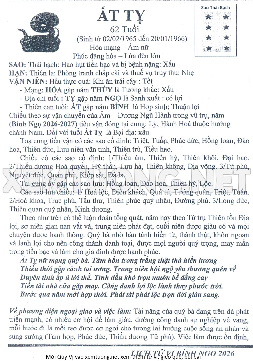 Tử Vi Năm Bính Ngọ 2026 mạng nữ ẤT TỴ