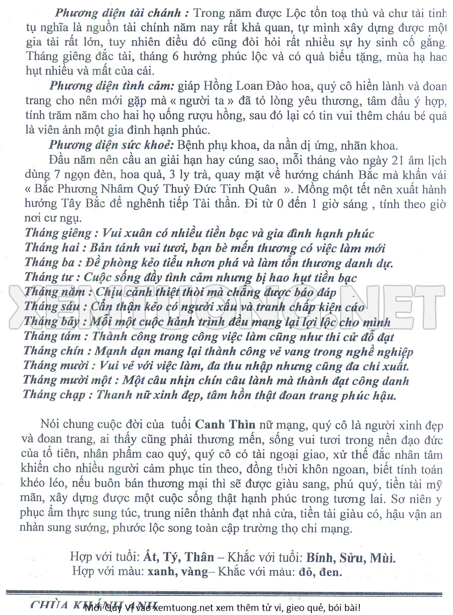 Tử Vi Năm Bính Ngọ 2026 mạng nữ CANH THÌN