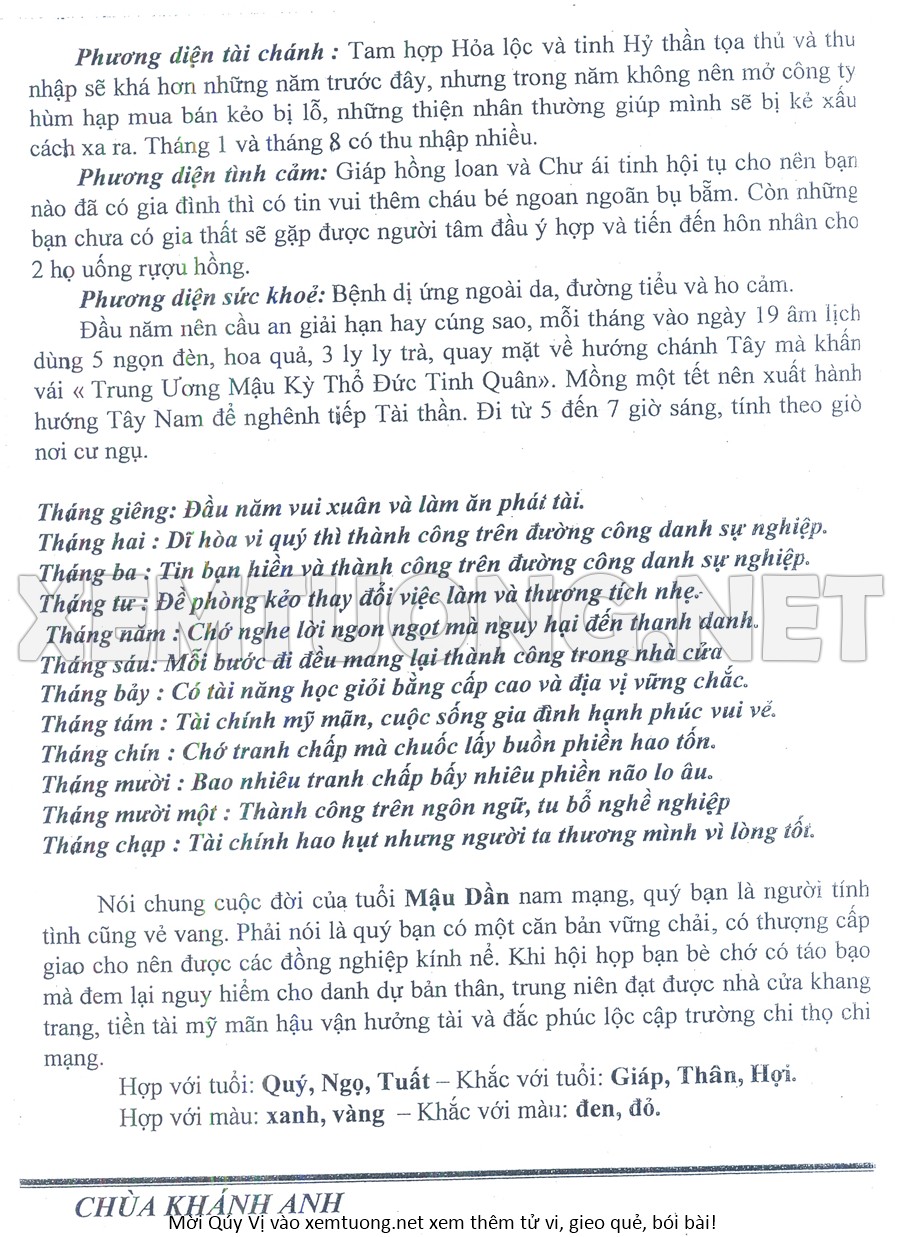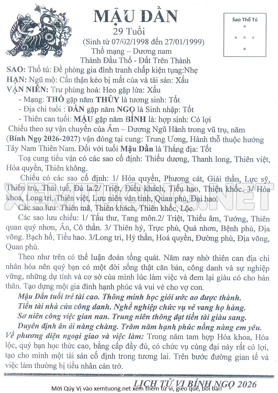 Tử Vi Năm Bính Ngọ 2026 mạng nam MẬU DẦN