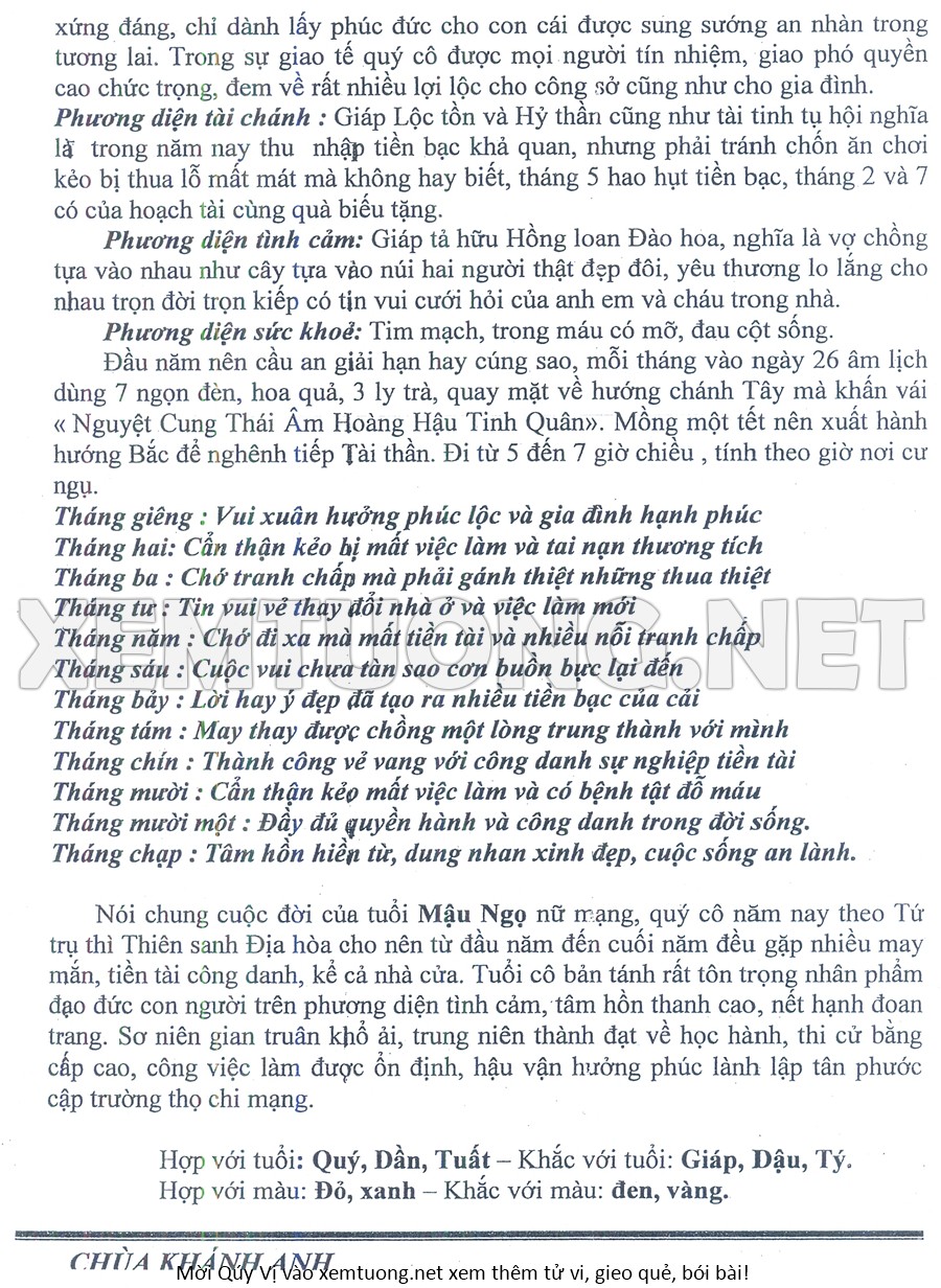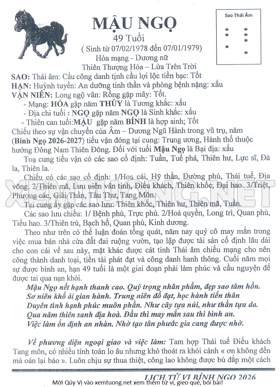 Tử Vi Năm Bính Ngọ 2026 mạng nữ MẬU NGỌ