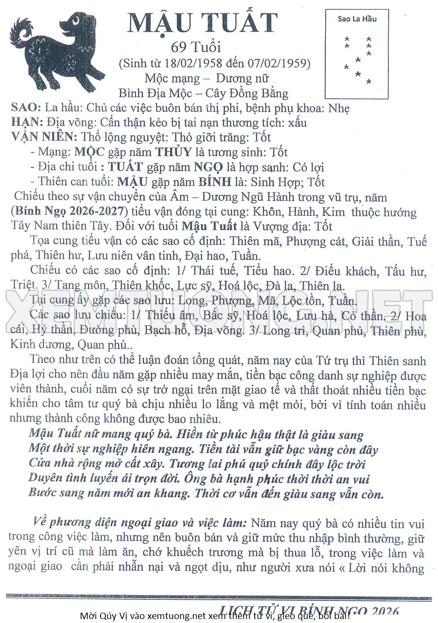 Tử Vi Năm Bính Ngọ 2026 mạng nữ MẬU TUẤT
