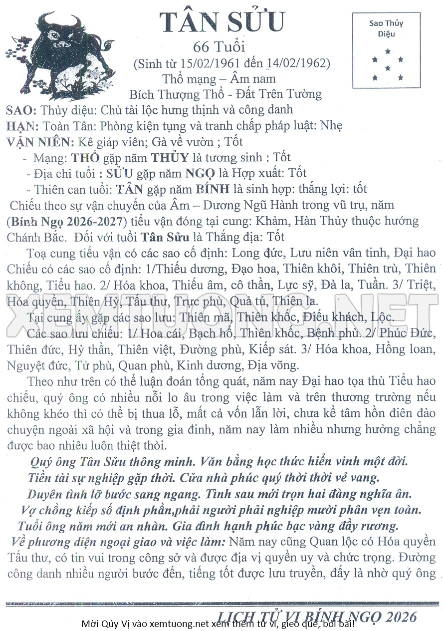 Tử Vi Năm Bính Ngọ 2026 mạng nam TÂN SỬU